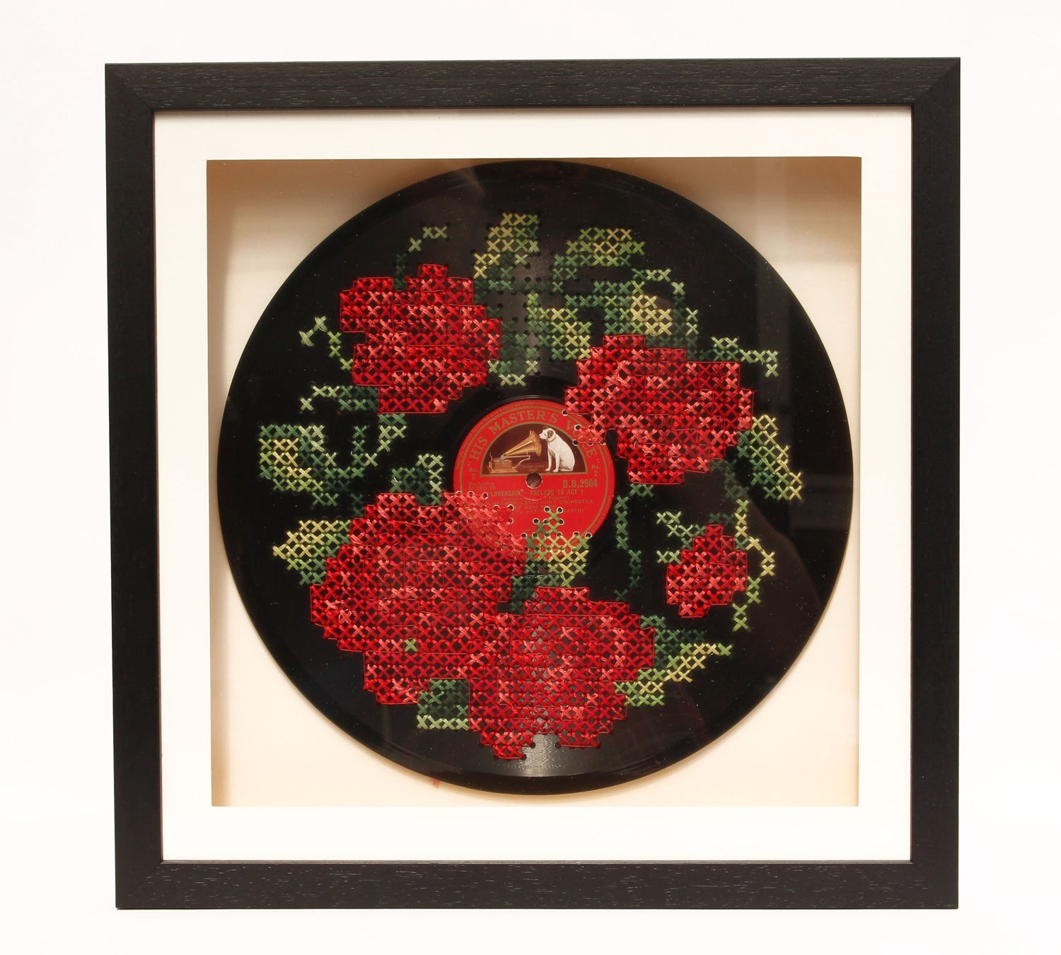 12 inch 78 Vinyl record, cross stitched with a rose wreath. This was this first full attempt to cross stitch through a 12 inch vinyl record