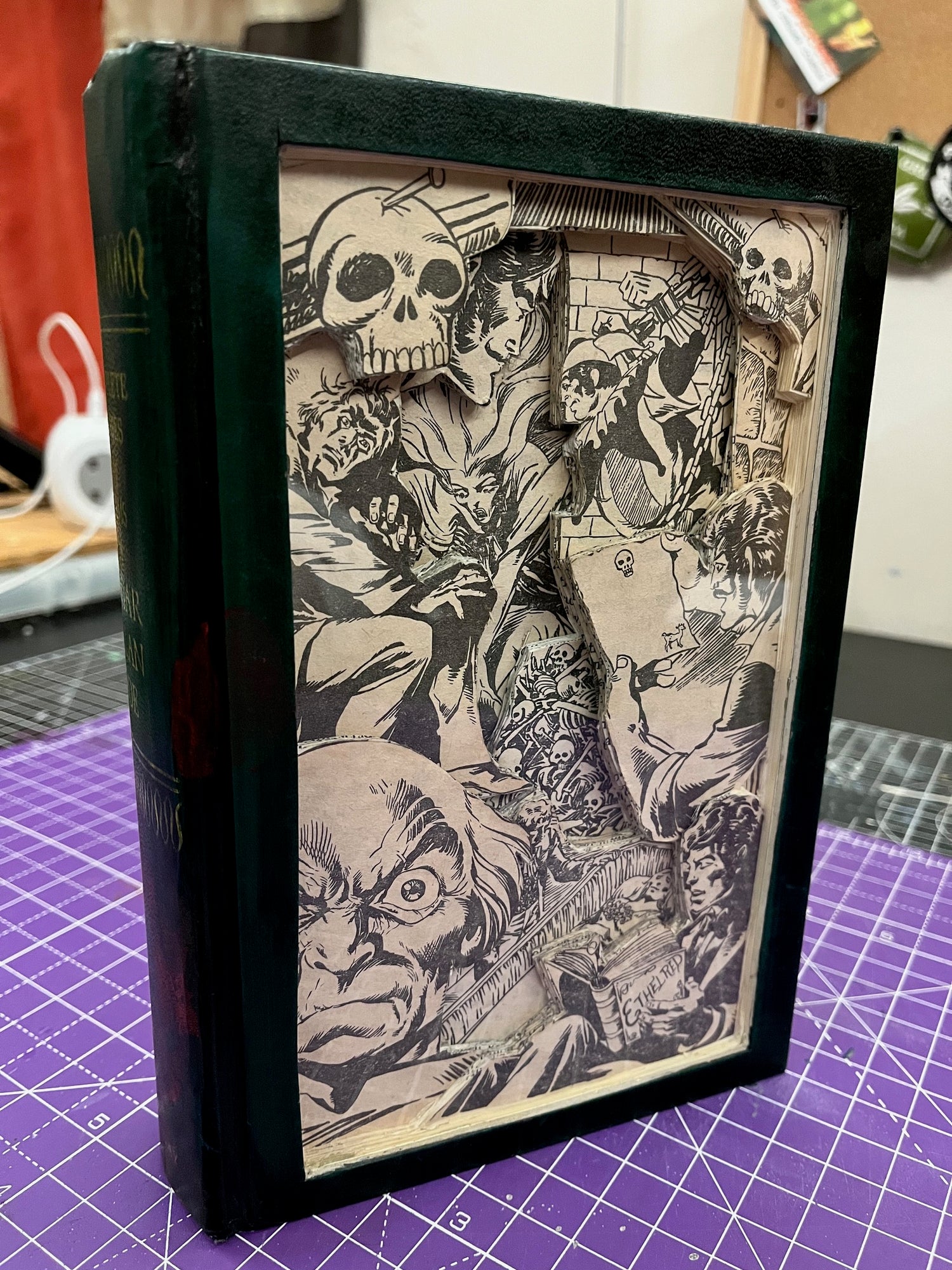 Small book carving / altered book for any horror lover. This is The Complete Stories and Poems of Edgar Allan Poe book that has been turned into a free standing sculpture. This book has been created using two books, one had no illustrations and one was a pulp fiction type book with lots of illustrations but very small. The book has been given a coat of black ink to bring the green down to look like a eerie green fog and there is a bloody hand print on the back, spine and part of the front.