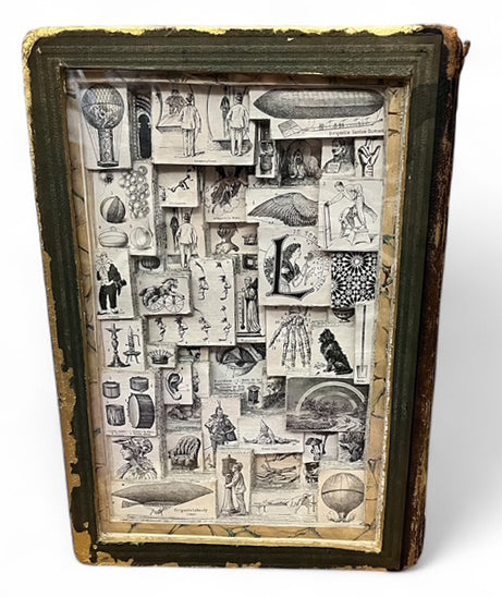 This is a Large Larousse Dictionary Book Carving which stands at 30 CMs tall.  The book had some considerable damage to it, and been well used ,had wear and tear to most of the pages. The cover was black, or so I thought, I gave it a gentle clean to see that the front cover was actually green.  The cover has been left so it has a partially ethereal look to it.  The spine is leather and the covers are fabric.  All illustrations within the carving are from the book. The book has an Art Nouveau cover but the illustrations are done in a Art Deco block style.