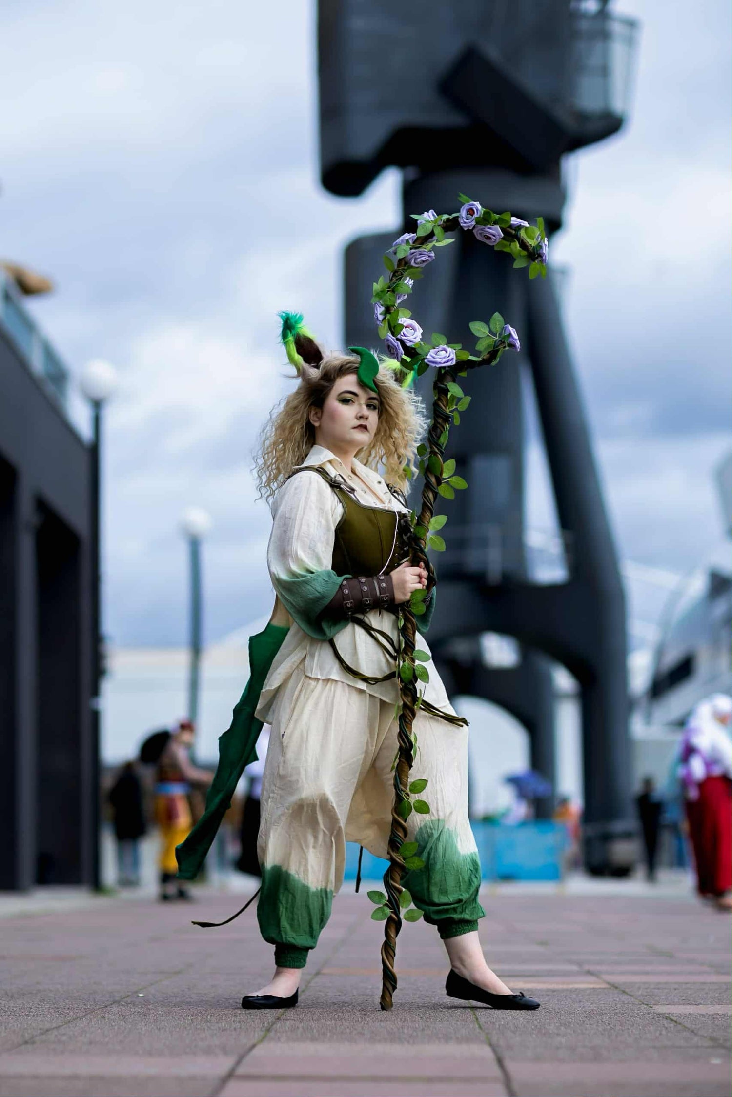 The staff is created from P.V.A pipe which is heated into shape, window insulation foam for the vines, customised fake roses with pokeballs in centre and fake vine leaves. The ears are armature wire with faux fur and the cape was a meter of cotton cut, stitched into shape and part dyed with leaf clasps holding it onto the corset.