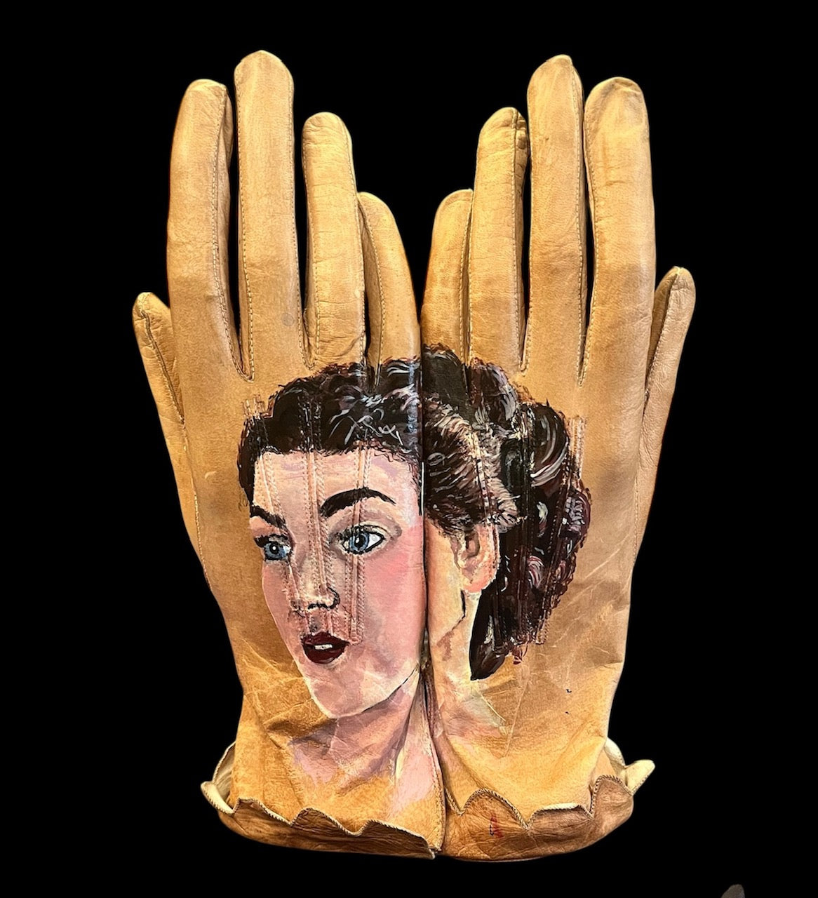 These gloves were produced as a colab with Rebecca Lachance for the Buzz Jam Exhibition being held in Leighton Buzzard in Oct. With this piece the tow of us worked together, myself creating this and Rebecca writing a song to accompany the piece. This portrait used Rebecca as a reference source for the Edwardian Lady and the gloves were the reference for Rebecca to write her song.