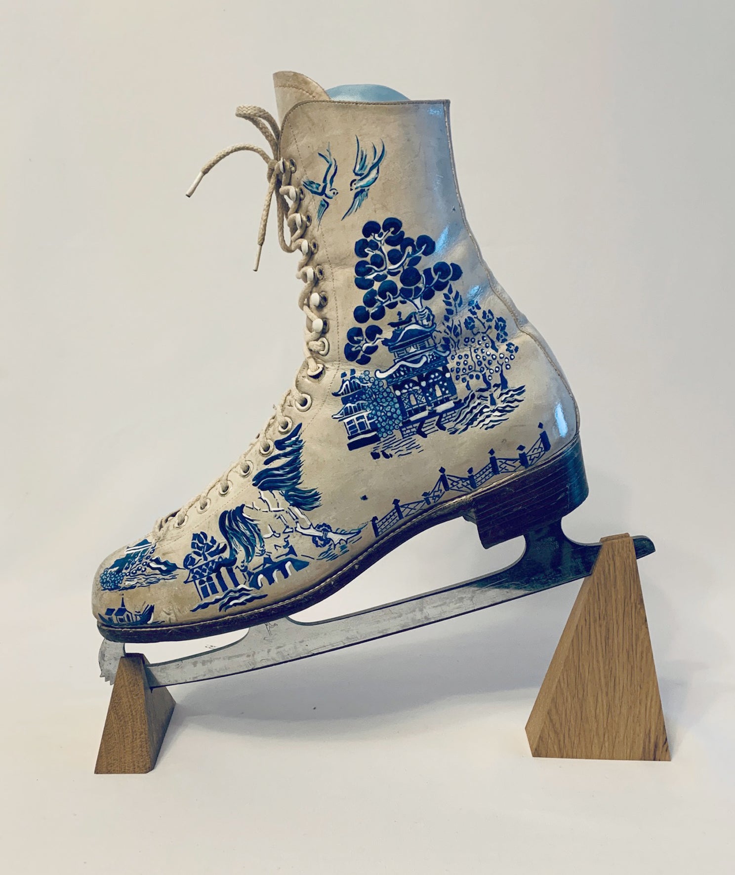 I found a pair skates at a local boot sale and my daughter and I were discussing how the colour of the boots looked like old plates, to which my daughter suggested I try to paint them with the Willow pattern, both boots were painted and given wood display stands