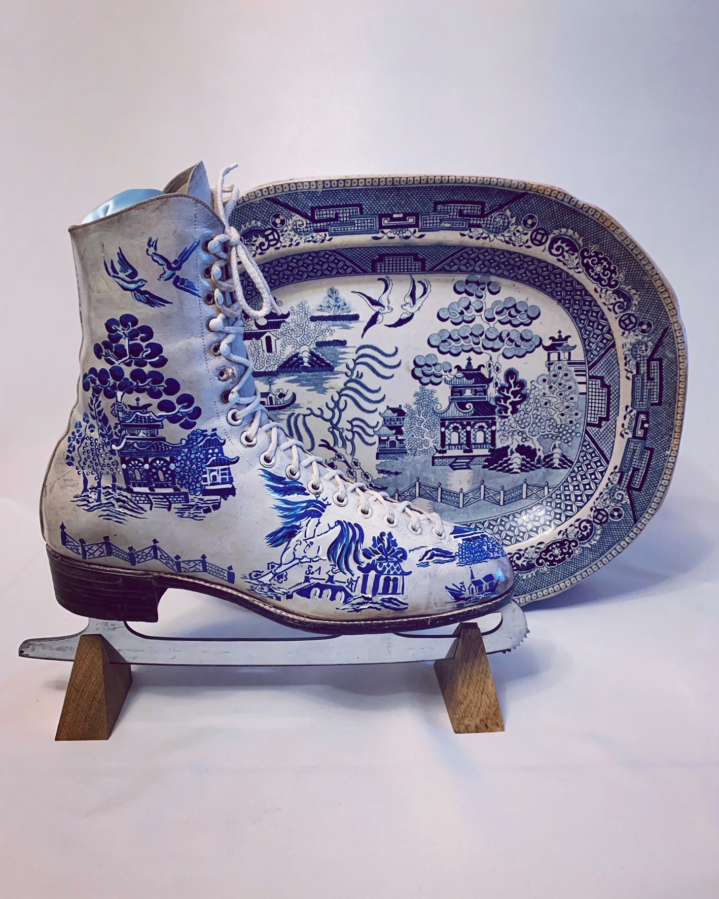 1950's leather skates, painted in the Willow pattern design to mimic a Willow Pattern Plate. The colour of the leather looks like vintage ceramics plates so both boots were painted in the willow pattern design.