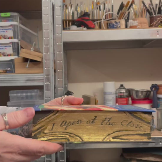 This book has been decorated with the golden snitch that appears in later books when Harry is trying to find and destroy the Horcruxes. The quote "I open at the close" is inscribed into the Golden Snitch and is where Dumbledor hides the resurrection stone. The fore edge has a combination of hand painted letters, gold gild paint and gold foil to give the impression that the snitch is worn.