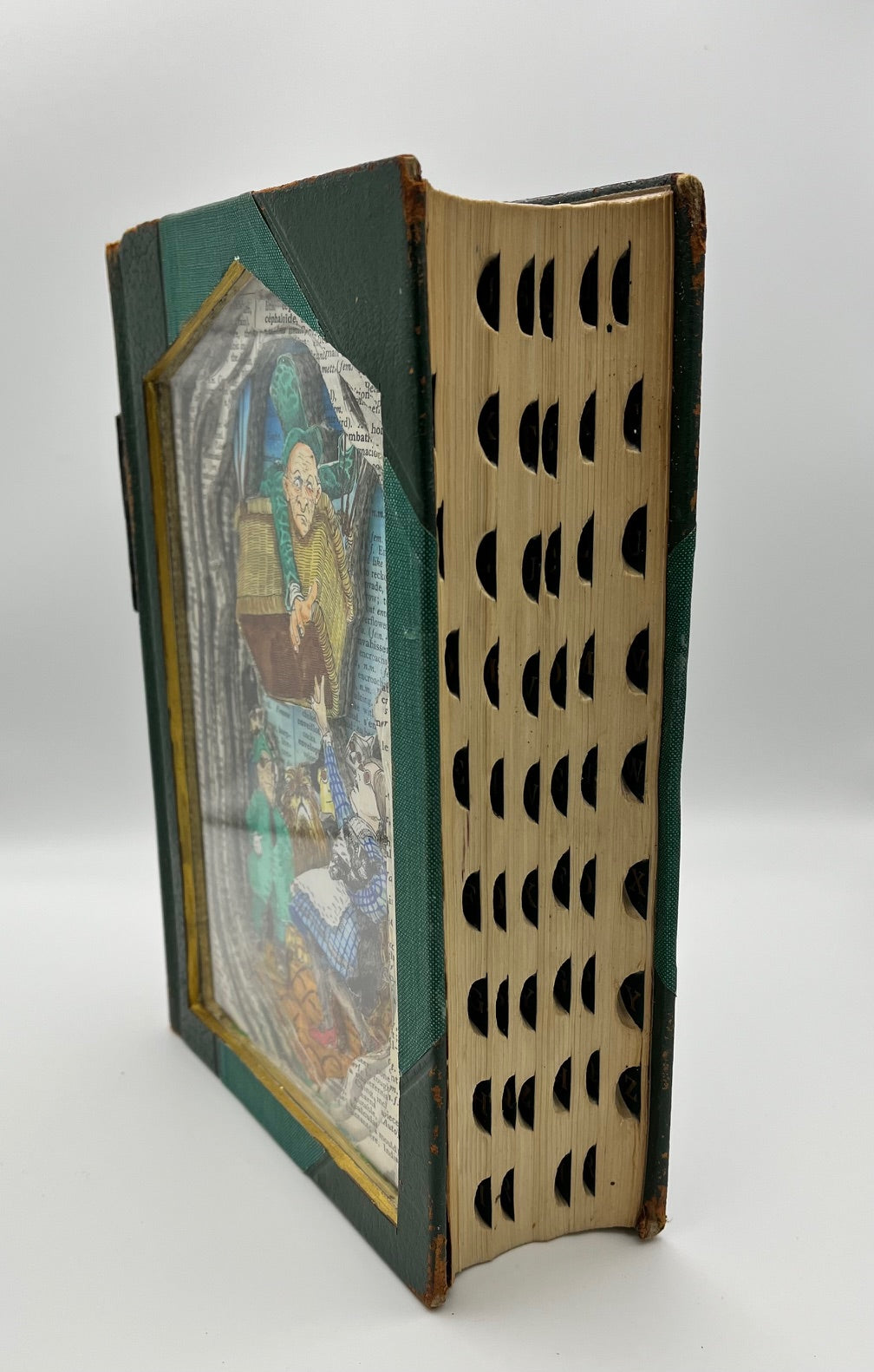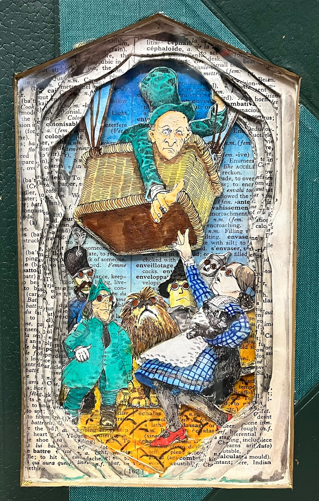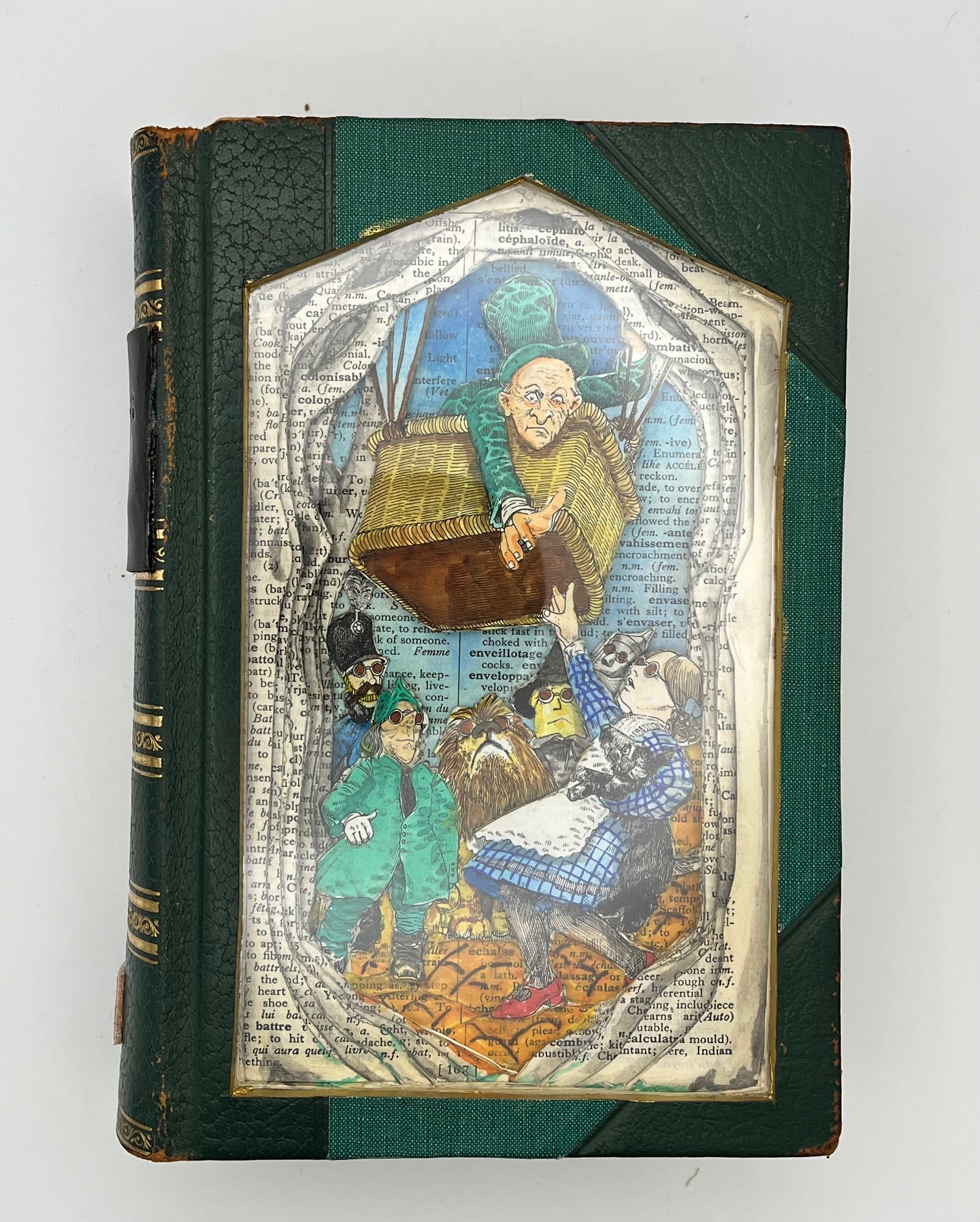 This is a Book Carving titled Leaving Oz. I have been asked a few times about doing a Wizard of Oz themed book and here it is. The book was created using a vintage French dictionary and a single illustration of Dorothy trying to leave Oz by balloon with the Wizard. The carving is 3D and is a solid sculpture that can be displayed any where with in the home. The book can be turned into a wall hanging upon request.