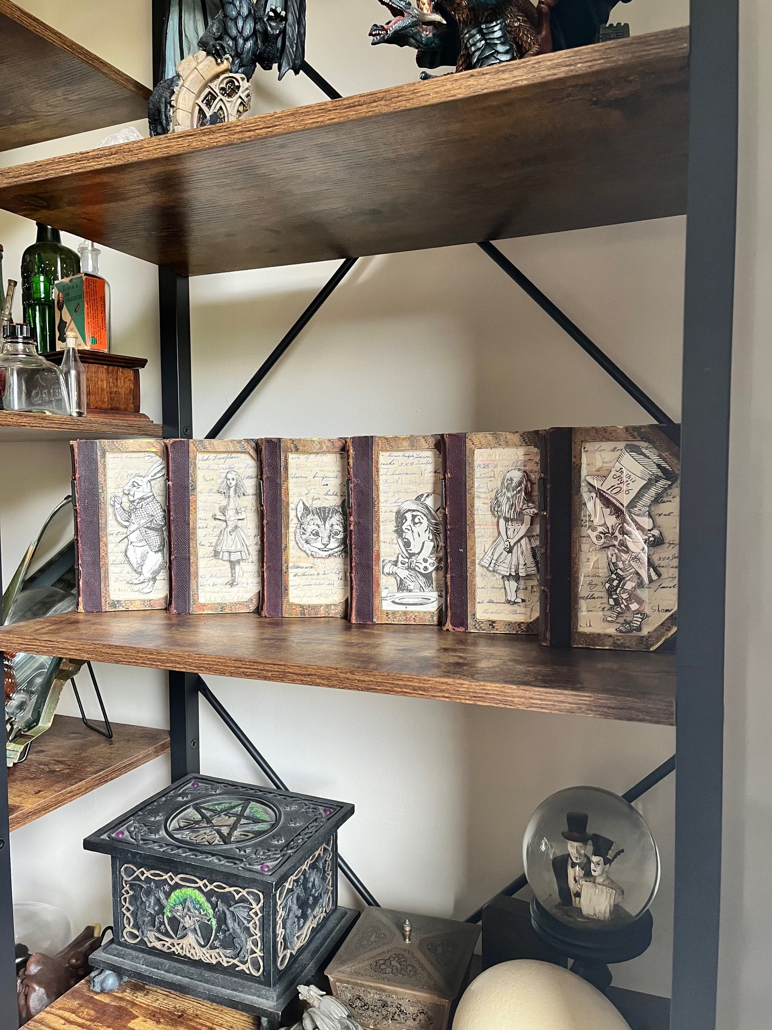 This is one of several Alice books that are available in my store. This book has been created using a old damaged books, scraps of hand written words on vintage paper, and a Alice in Wonderland illustration.