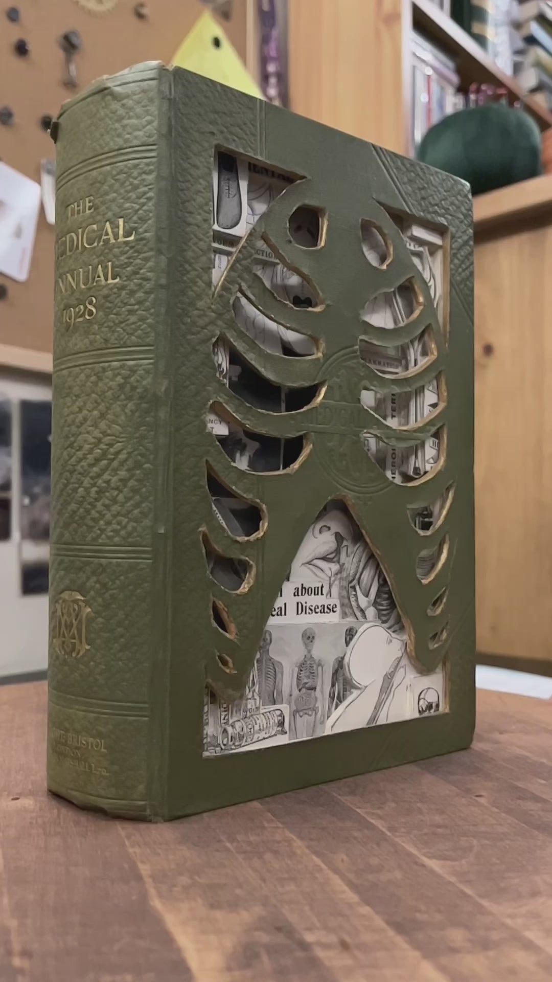 For Sale is Bones, a 3D Book carving with opening cover that has been carved into the shape of ribs and when opened reveals old medical imagery and out dated medical terms.