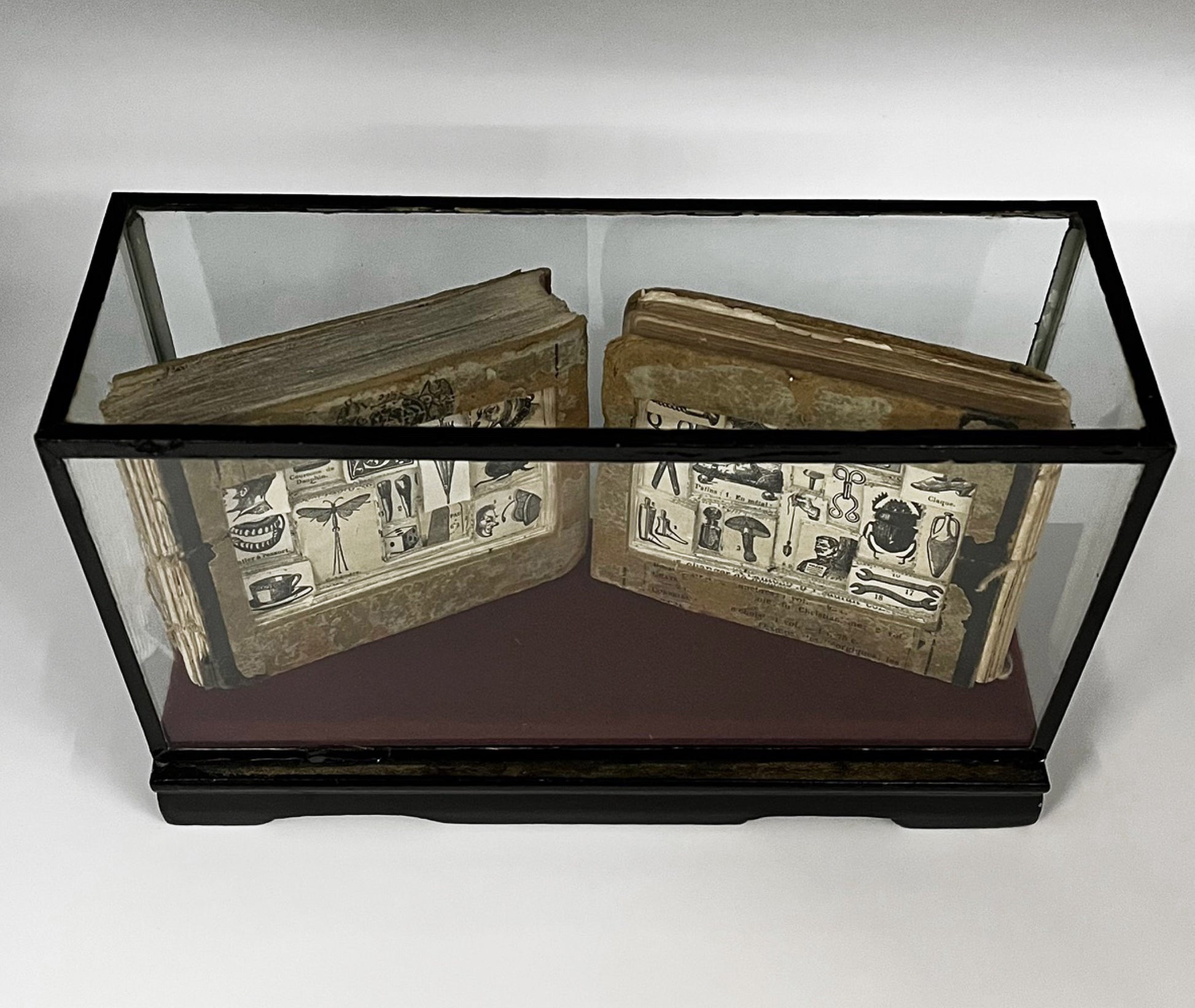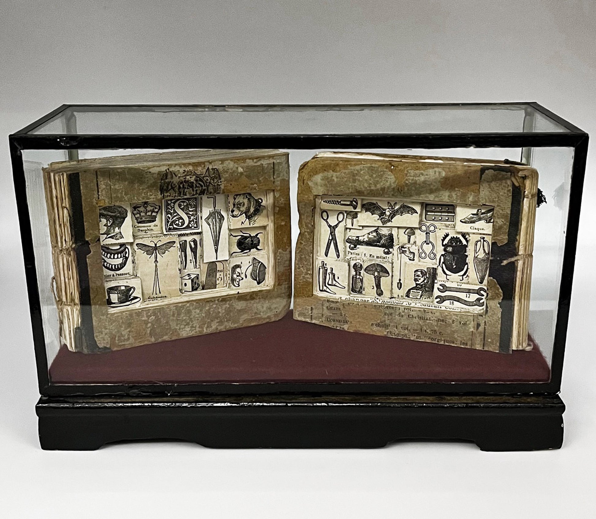 It was the vintage glass case that gave me the idea for this project. I found the case with no content and was slightly damaged and I found out there would have been 3 decorated eggs inside. The case is glass and pressed wood and has its original paper makers label and dates to approx. 1970s. So finding a small damage book I created two small double sided carved books. The book itself was a very damaged French script and using left over illustrations from a vintage French dictionary to create the carving in the inside. Calling them the egg books seemed apt.