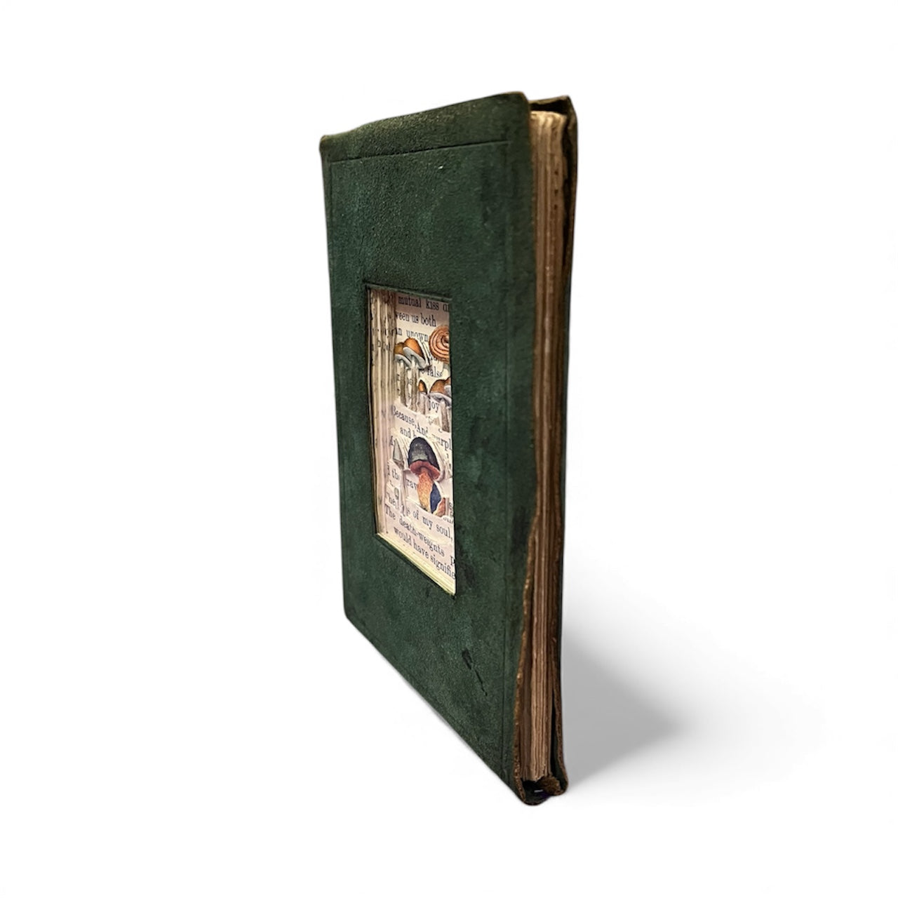 This is the Mini Mushroom Hill. This is one of the smallest book carvings I have done to date. The book is a old suede covered poetry book and has been turned into a small wall hanging book. Normally I glue my books shut but this one is stitched shut but you can't tell that its been done and was and experiment for me to learn different ways to finish my book carvings. The size of this book is 14cm x 10cm x 1cm